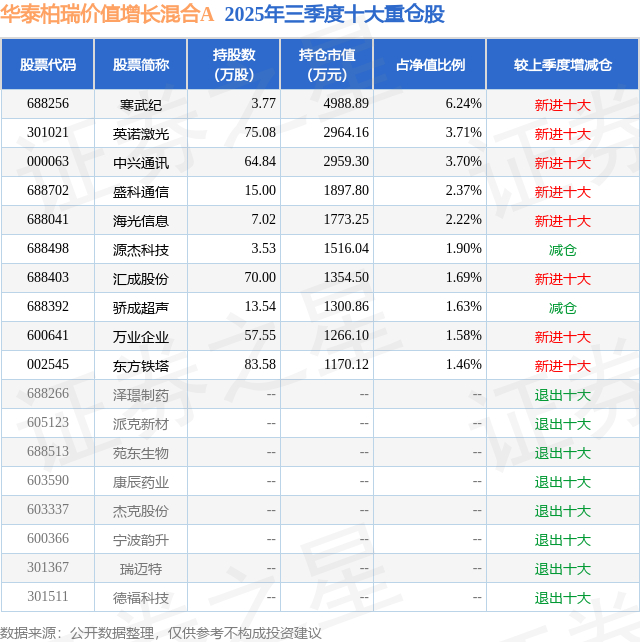 华泰柏瑞价值增长混合A的前十大重仓股如下: