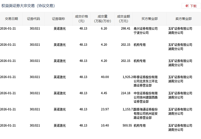 1月21日,英诺激光大宗交易成交93.42万股,成交额4496.36万元,占当日总成交额的5.28%,成交价48.13元,较市场收盘价61.66元折价21.94%。