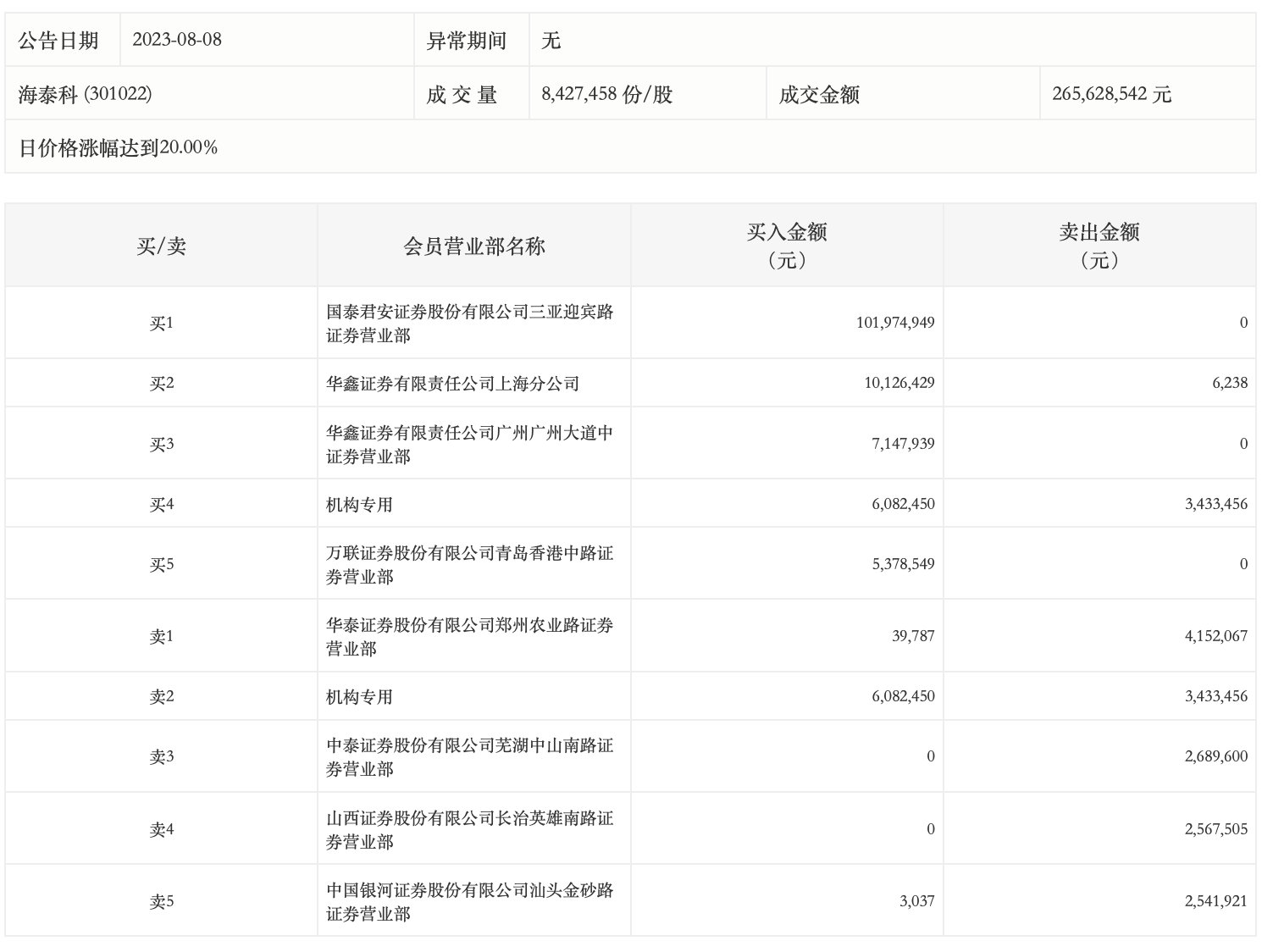 8月8日,海泰科今日涨停,龙虎榜数据显示,上榜营业部席位全天成交1.46亿元,占当日总成交金额比例为55.02%。其中,买入金额为1.31亿元,卖出金额为1539.08万元,合计净买入1.15亿元。