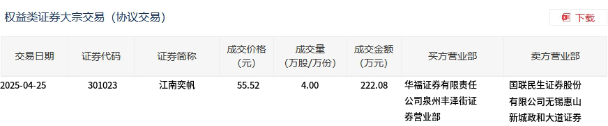 江南奕帆今日大宗交易折价成交4万股,成交额222.08万元