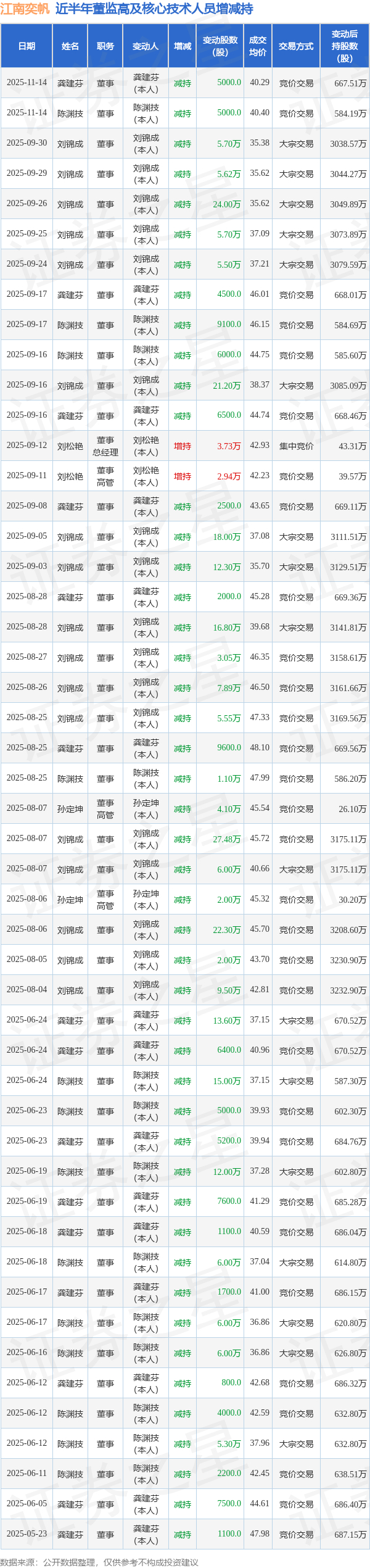 江南奕帆近半年内的董监高及核心技术人员增减持详情如下: