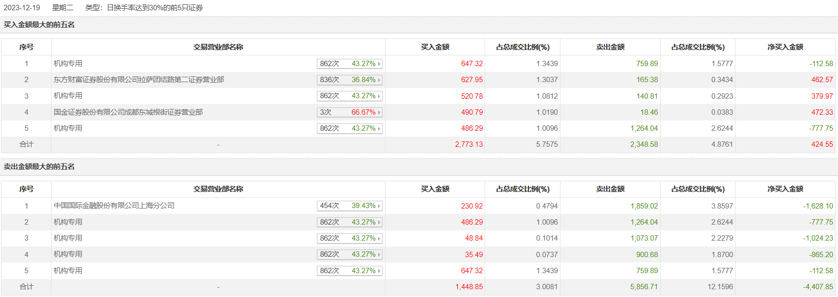 读客文化12月19日涨11.11%,全天换手率达33.75%,振幅达21.07%。龙虎榜数据显示,营业部席位合计净卖出3092.98万元。其中,机构买入1738.72万元,卖出4138.5万元,合计净卖出2399.78万元。此外,东方财富证券拉萨团结路第二证券营业部、国金证券成都东城根街证券营业部分别买入627.95万元、490.79万元;中国国际金融上海分公司、东方财富证券拉萨团结路第二证券营业部分别卖出1859.02万元、165.38万元。