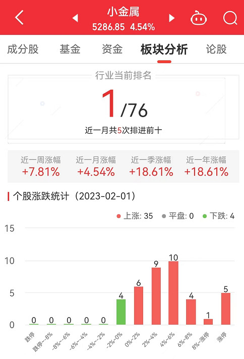 中国经济网北京2月1日讯 今日,小金属板块整体涨幅4.54%,其中,35只股票上涨,4只股票下跌。