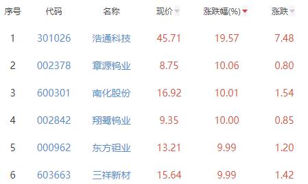 其中,浩通科技、章源钨业、南化股份、翔鹭钨业、东方钽业、三祥新材位列板块涨幅前五位,涨幅分别为19.57%、10.06%、10.01%、10.00%、9.99%、9.99%。