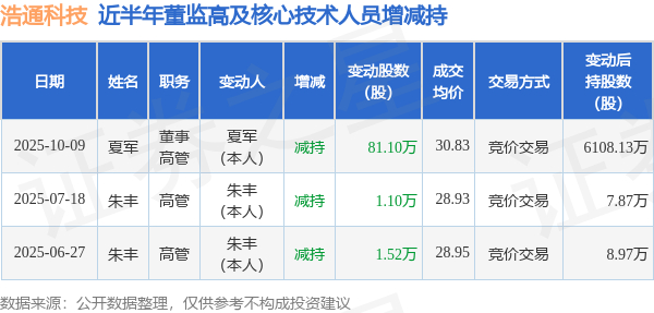 浩通科技近半年内的董监高及核心技术人员增减持详情如下: