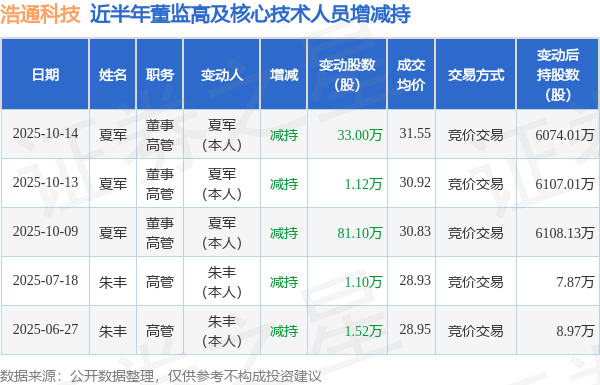 浩通科技近半年内的董监高及核心技术人员增减持详情如下: