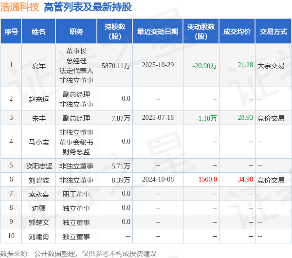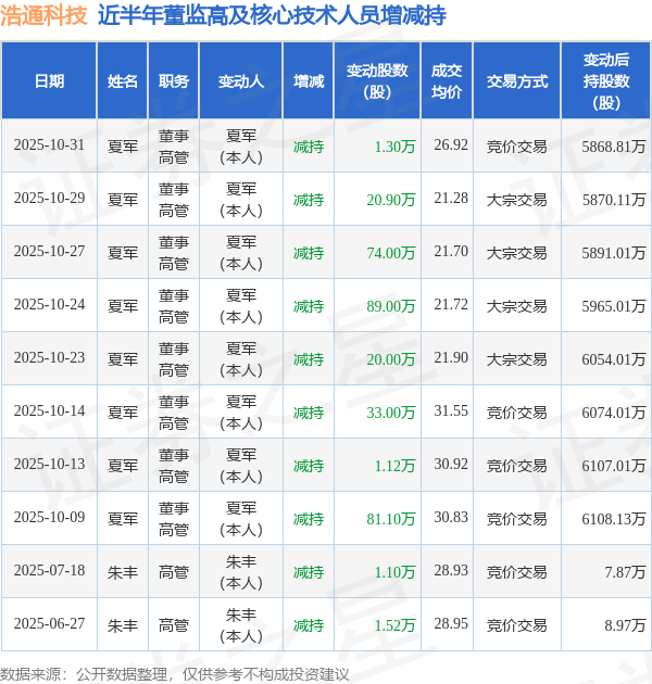 浩通科技近半年内的董监高及核心技术人员增减持详情如下: