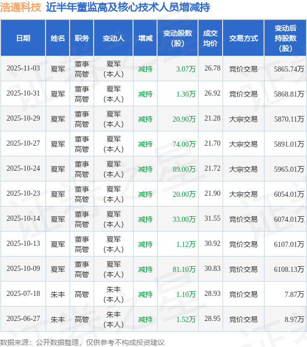 浩通科技近半年内的董监高及核心技术人员增减持详情如下: