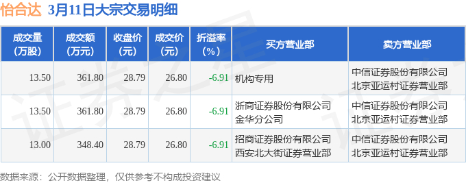 3月11日怡合达现3笔大宗交易 机构净买入361.8万元