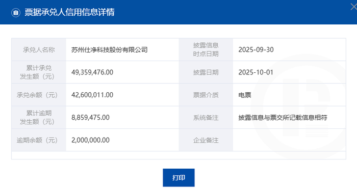 仕净科技截至9月末的票据逾期情况,来源:上海票据交易所官网仕净科技主营业务是制程污染防控设备、末端污染治理设备的研发、生产和销售。对此次票据逾期的原因,财闻邮件询问了仕净科技方面,截至发稿未能得到回复。