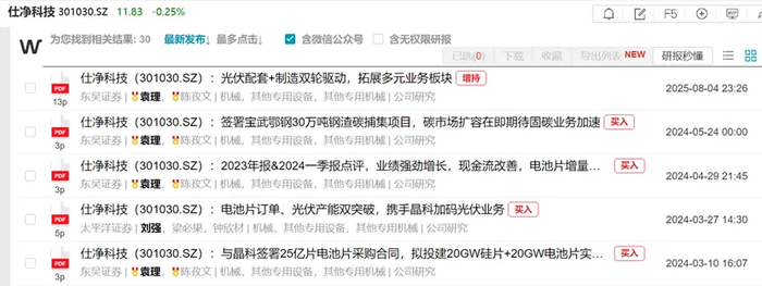 说起来,伴随着股价的跌跌不休、成交的日渐冷清,仍然在关注仕净科技的机构也没几家了。从Wind收录的研报来看,整个2025年也只有东吴证券(601555.SH)这一家,千顷地、一棵苗。而且拉长时间段来看,也是自2024年3月之后这近两年里,也只有5份券商研报,其中4份来自东吴证券的分析师袁理、陈孜文。