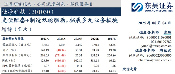 尽管这份坚守和执着实在值得敬佩,但就预判的质量,就没法说了。在2025年8月发布的这份题为《光伏配套+制造双轮驱动,拓展多元业务板块》的报告中,两位分析师针对仕净科技2025年和2026年营收,给出的预测为31.49亿元、39.13亿元,净利润为0.22亿元和1.53亿元。