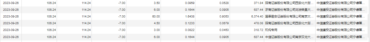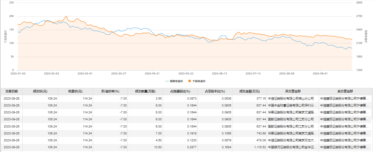 9月26日大宗交易成交132.55万股,成交额1.41亿元,占当日总成交额的87.91%,成交价106.24元,较市场收盘价114.24元折价7.0%。