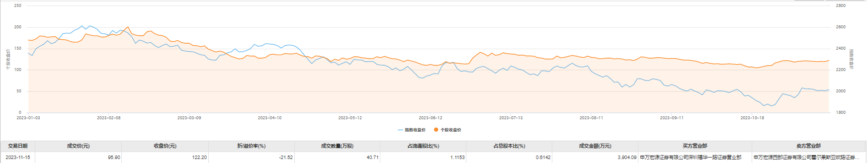今日大宗交易成交40.71万股,成交额3904.09万元,占当日总成交额的51.14%,成交价95.9元,较市场收盘价折价21.52%。