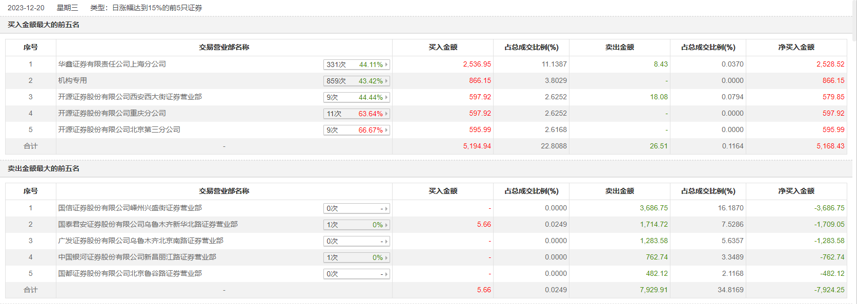 12月20日,新柴股份今日涨停,全天换手率达23.32%,振幅达19.92%。龙虎榜数据显示,营业部席位合计净卖出2755.82万元。其中,机构合计净买入866.15万元。此外,华鑫证券上海分公司、开源证券重庆分公司分别买入2536.95万元、597.92万元;国信证券嵊州兴盛街证券营业部、国泰君安证券乌鲁木齐新华北路证券营业部分别卖出3686.75万元、1714.72万元。