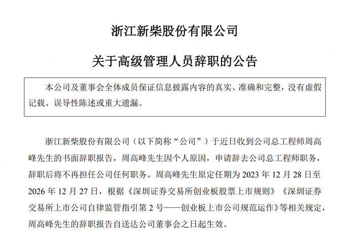 瑞财经 刘治颖 3月13日,新柴股份(SZ301032)公告,周高峰因个人原因,申请辞去公司总工程师职务,辞职后将不再担任公司任何职务。周高峰原定任期为2023年12月28日至2026年12月27日。