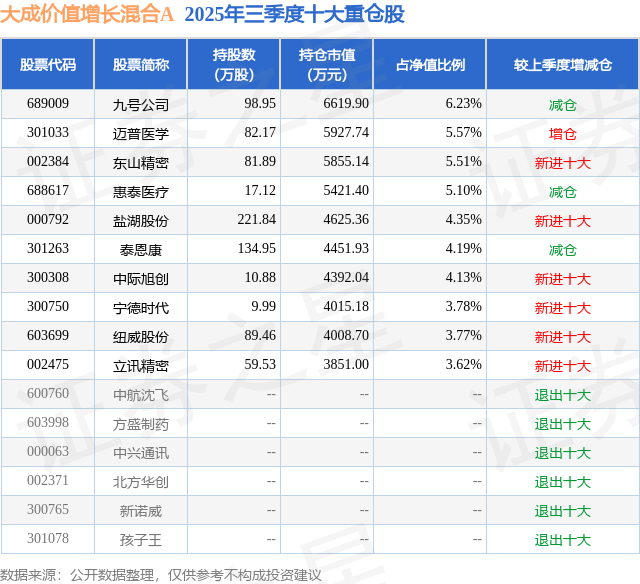 大成价值增长混合A的前十大重仓股如下: