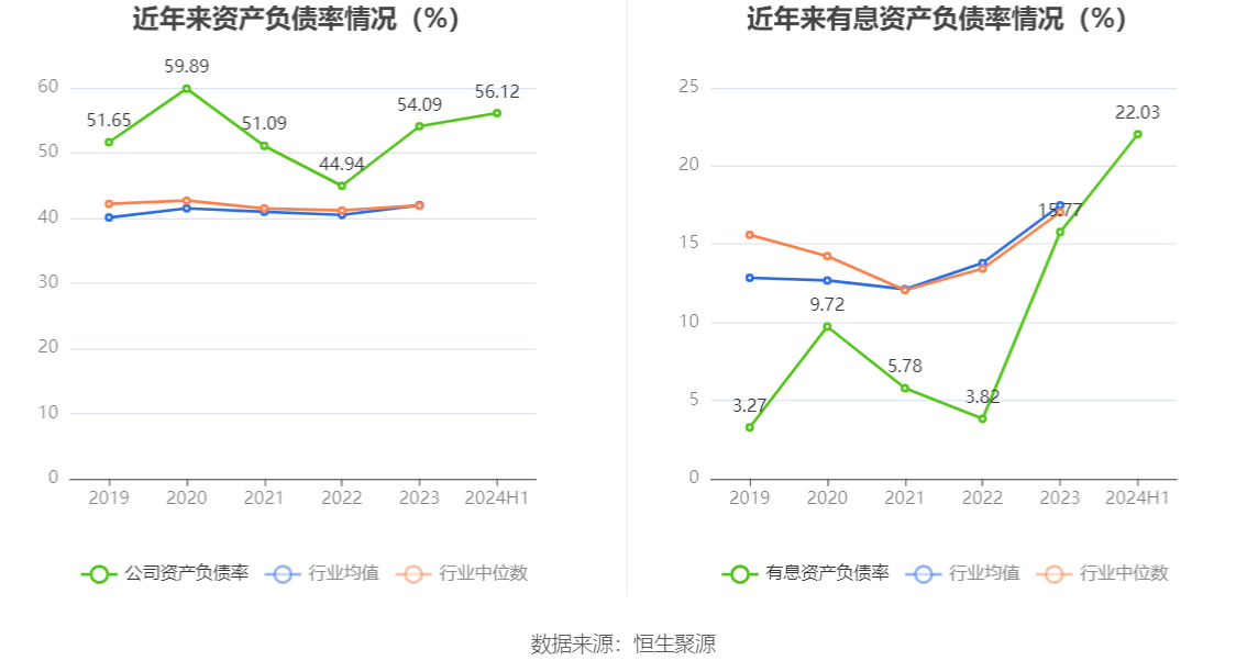 在偿债能力方面,公司2024年上半年末资产负债率为56.12%,相比上年末上升2.03个百分点;有息资产负债率为22.03%,相比上年末上升6.26个百分点。