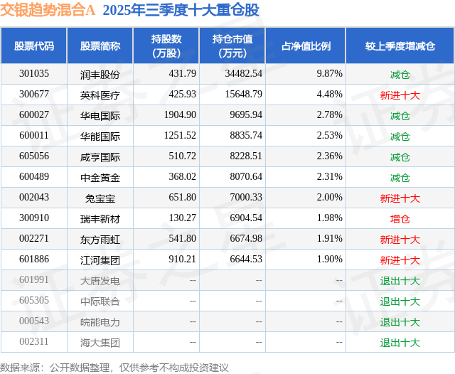 交银趋势混合A的前十大重仓股如下: