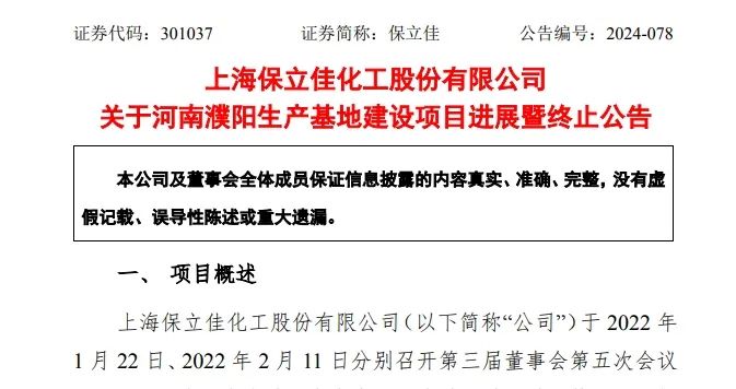 慧正资讯,12月10日,保立佳发布了一则重要公告,宣布终止其在河南濮阳的生产基地建设项目。这一消息引发了市场的广泛关注,不仅因为该项目是保立佳产能布局上的一次重要调整,更反映了当前化工行业面临的复杂挑战和不确定性。