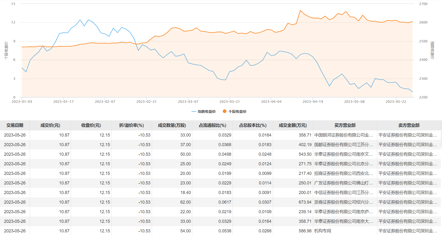 5月26日大宗交易成交377.4万股,成交额4102.34万元,占当日总成交额的24.71%,成交价10.87元,较市场收盘价12.15元折价10.53%。