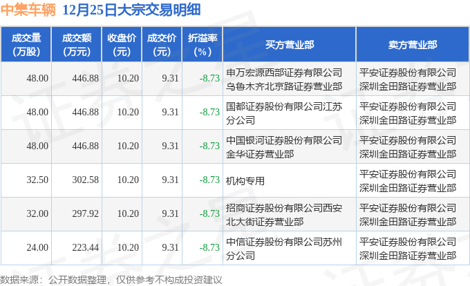 12月25日中集车辆现6笔大宗交易 机构净买入302.58万元
