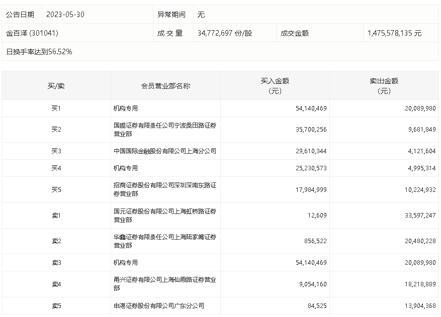 5月30日,金百泽今日涨停,龙虎榜数据显示,上榜营业部席位全天成交3.08亿元,占当日总成交金额比例为20.87%。其中,买入金额为1.73亿元,卖出金额为1.35亿元,合计净买入3736.0万元。