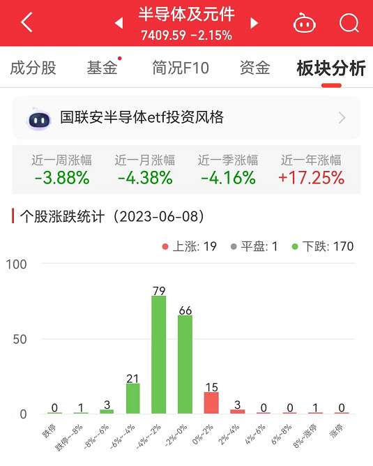 数据显示,截至今日,半导体及元件板块近一周涨幅-3.88%,近一月涨幅-4.38%,近一季涨幅-4.16%。
