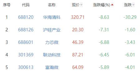 华海清科、沪硅产业、力芯微、联动科技、富瀚微位列涨幅榜后五位,涨幅分别为-8.63%、-7.31%、-6.88%、-6.45%、-5.89%。