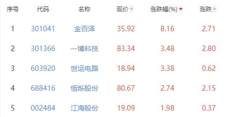 其中,金百泽、一博科技、世运电路、恒烁股份、江海股份位列板块涨幅前五位,涨幅分别为8.16%、3.48%、3.38%、2.74%、1.98%。