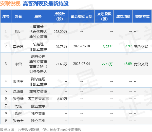证券之星消息,根据9月19日市场公开信息、上市公司公告及交易所披露数据整理,安联锐视(301042)最新董监高及相关人员股份变动情况:2025年9月18日公司董事,高管李志洋共减持公司股份3.75万股,占公司总股本为0.0538%。变动期间公司股价上涨19.99%,9月18日当日收盘报54.92元。