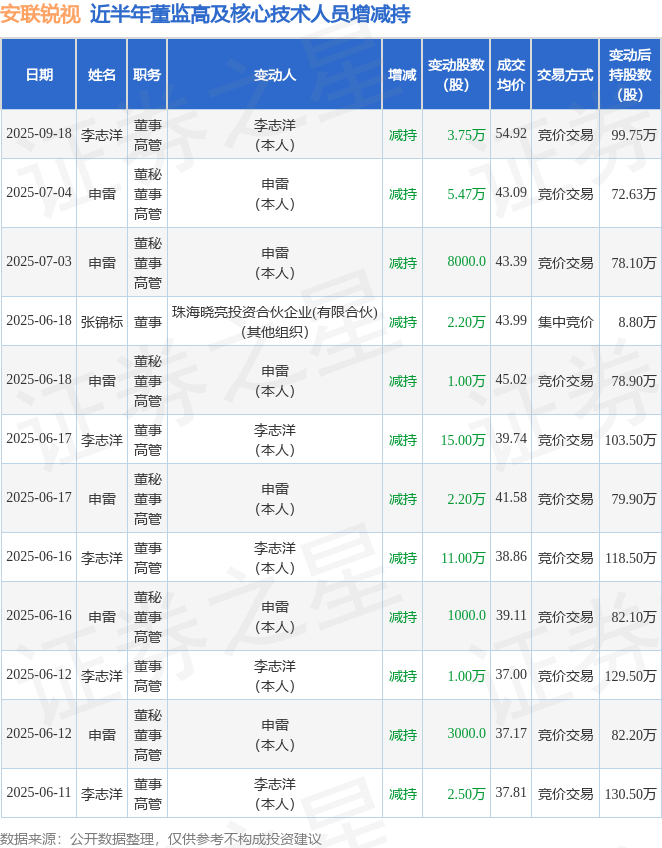 安联锐视近半年内的董监高及核心技术人员增减持详情如下: