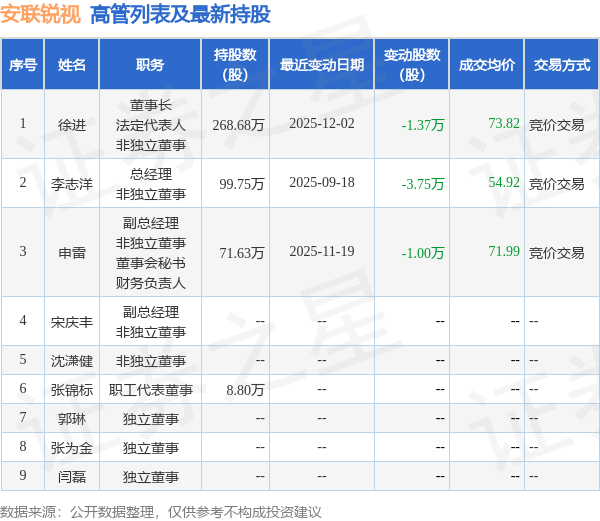 证券之星消息,根据12月25日市场公开信息、上市公司公告及交易所披露数据整理,安联锐视(301042)最新董监高及相关人员股份变动情况:2025年12月24日公司董秘,董事,高管申雷共减持公司股份5000.0股,占公司总股本为0.0072%。变动期间公司股价上涨2.18%,12月24日当日收盘报85.01元。