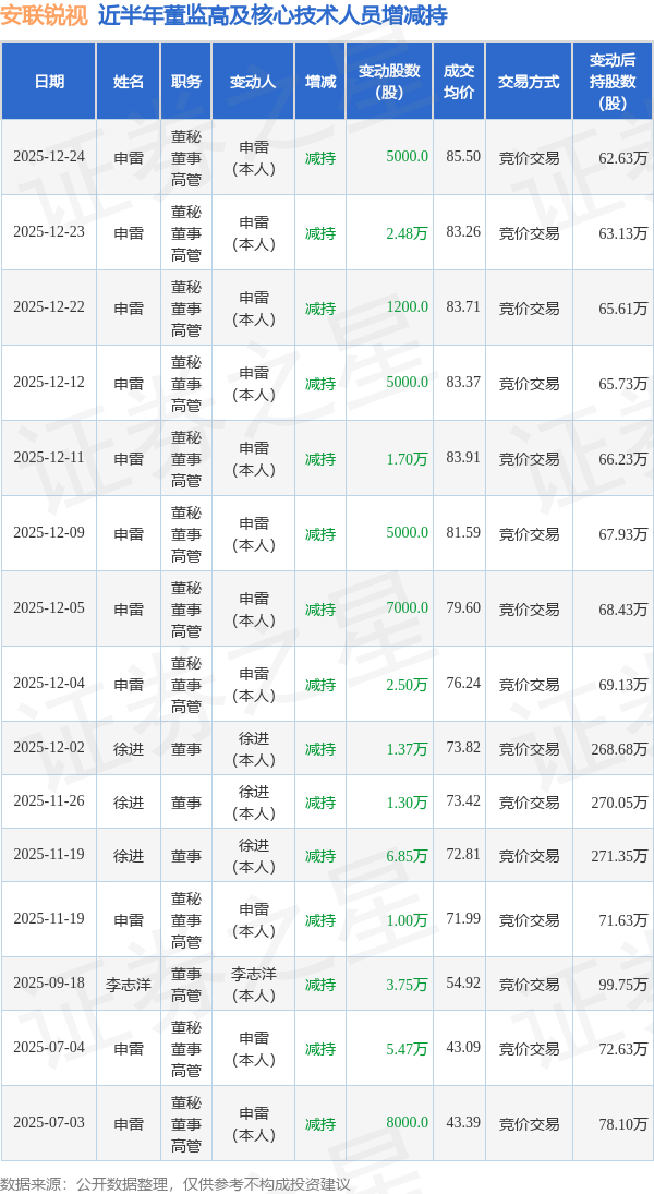 安联锐视近半年内的董监高及核心技术人员增减持详情如下: