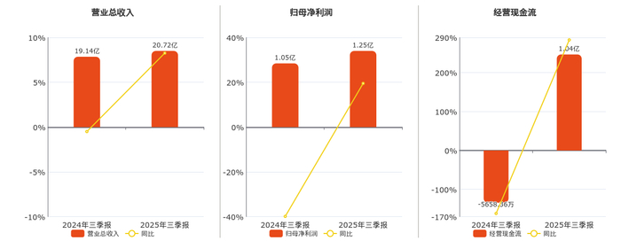 公司营业总收入为20.72亿元,较去年同报告期营业总收入增加1.58亿元,同比较去年同期上涨8.26%。归母净利润为1.25亿元,较去年同报告期归母净利润增加2043.58万元,同比较去年同期上涨19.51%。经营活动现金净流入为1.04亿元,较去年同报告期经营活动现金净流入增加1.61亿元。