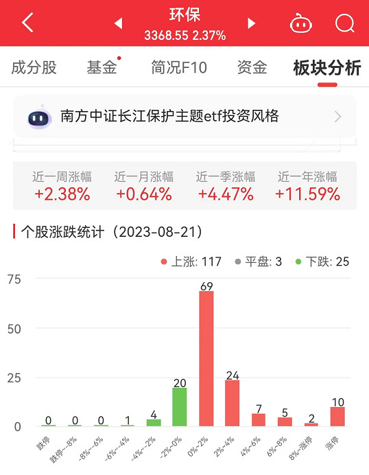 中国经济网北京8月21日讯 今日,环保板块整体涨幅2.37%,其中,117只股票上涨,3只股票平盘,25只股票下跌。