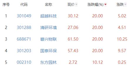 其中,超越科技、清研环境、碧兴物联、国泰环保、东方园林(维权)位列板块涨幅前五位,涨幅分别为20.00%、20.00%、20.00%、20.00%、10.12%。