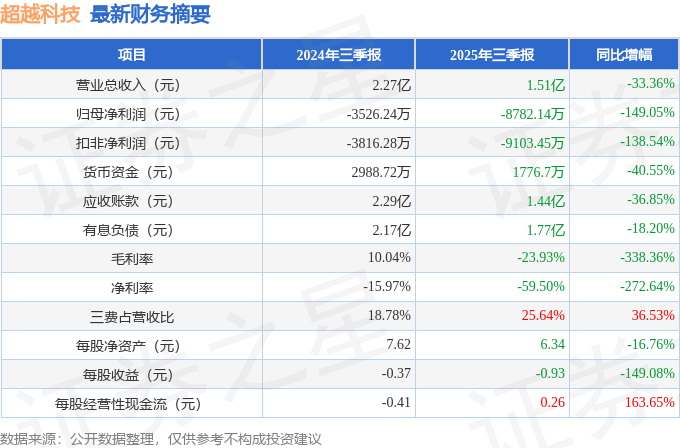 据证券之星公开数据整理,近期超越科技(301049)发布2025年三季报。截至本报告期末,公司营业总收入1.51亿元,同比下降33.36%,归母净利润-8782.14万元,同比下降149.05%。按单季度数据看,第三季度营业总收入7295.76万元,同比下降10.49%,第三季度归母净利润-2889.28万元,同比下降82.21%。本报告期超越科技三费占比上升明显,财务费用、销售费用和管理费用总和占总营收同比增幅达36.53%。