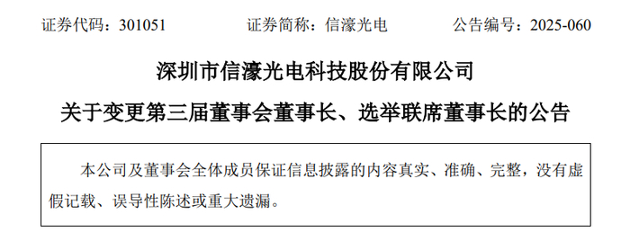 7月24日,信濠光电发布关于变更第三届董事会董事长、选举联席董事长的公告。公告显示,信濠光电于2025年7月22日召开第三届董事会第二十一次会议,审议通过了《关于变更第三届董事会董事长、选举联席董事长的议案》,公司已修改章程并在董事会中增设一名联席董事长。会议选举结果为,姚浩当选为信濠光电公司第三届董事会董事长,白如敬当选为第三届董事会联席董事长,任期从公司第三届董事会第二十一次会议审议通过之日起至公司第三届董事会任期届满之日止。