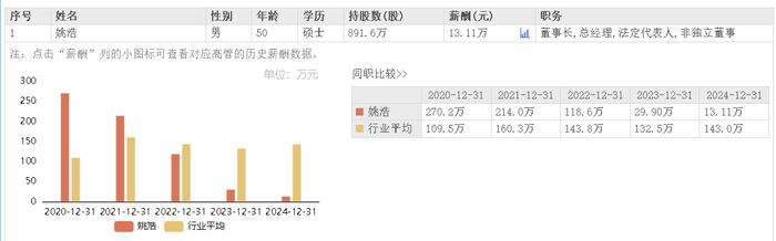 据东方财富网数据,信濠光电董事长兼总经理姚浩2024年领薪13.11万元。