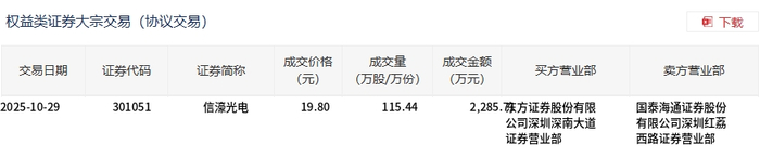 信濠光电今日大宗交易折价成交115.44万股,成交额2285.71万元