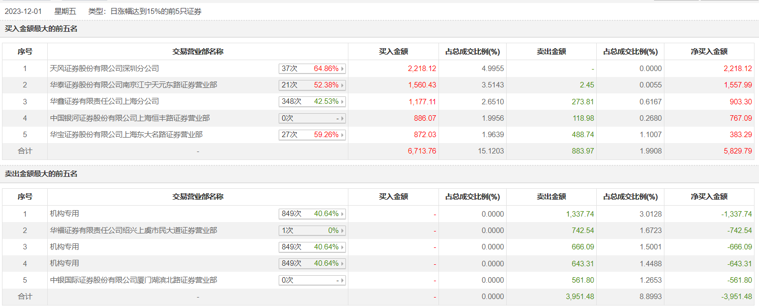 果麦文化12月1日涨停,全天换手率达13.05%,振幅达19.76%。龙虎榜数据显示,营业部席位合计净买入1878.31万元。其中,机构合计净卖出2647.14万元。此外,天风证券深圳分公司、华泰证券南京江宁天元东路证券营业部分别买入2218.12万元、1560.43万元;华福证券绍兴上虞市民大道证券营业部、中银国际证券厦门湖滨北路证券营业部分别卖出742.54万元、561.80万元。