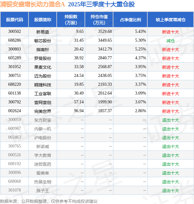 浦银安盛增长动力混合A的前十大重仓股如下:
