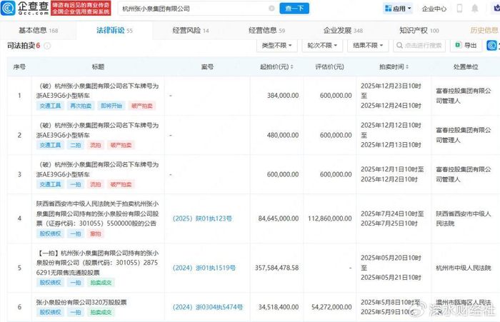 此后,股权拍卖接连发生:2025年4月,张小泉集团持有的2875万多股上市公司股份被司法拍卖,由上海兔跃呈祥公司以3.58亿元竞得,该公司实控人为网红MCN机构白兔集团创始人王傲延;7月,又有550万股被挂牌拍卖。