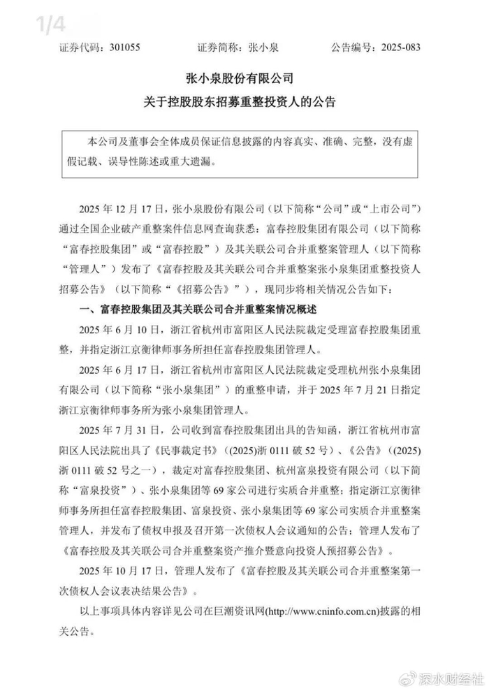 12月17日,上市公司张小泉公告,启动张小泉集团重整投资人招募工作。