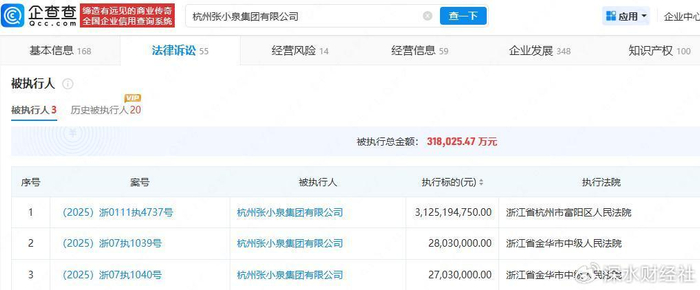 企查查显示,张小泉集团累计被执行金额超31.8亿元;同时还有8条限制消费令,金额超3.7亿元。