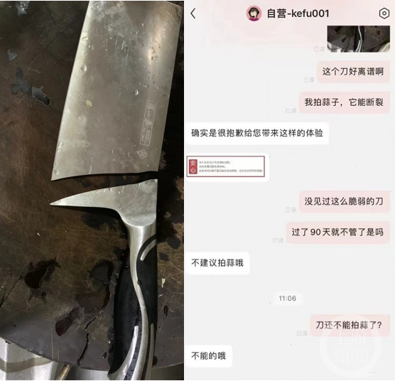 当时,有消费者反映使用张小泉菜刀拍蒜时发生断裂,而客服给出的“菜刀不能拍蒜”的回应引发舆论哗然。