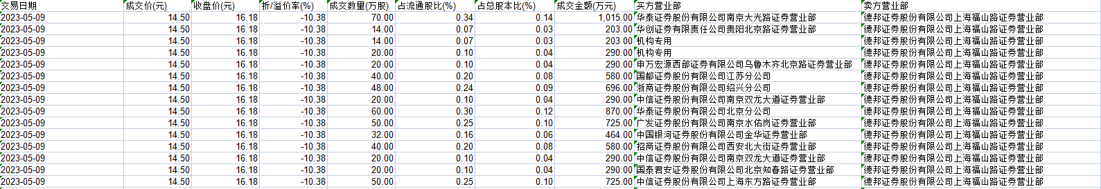 5月9日大宗交易成交518万股,成交额7511万元,占当日总成交额的16.82%,成交价14.5元,较市场收盘价16.18元折价10.38%。