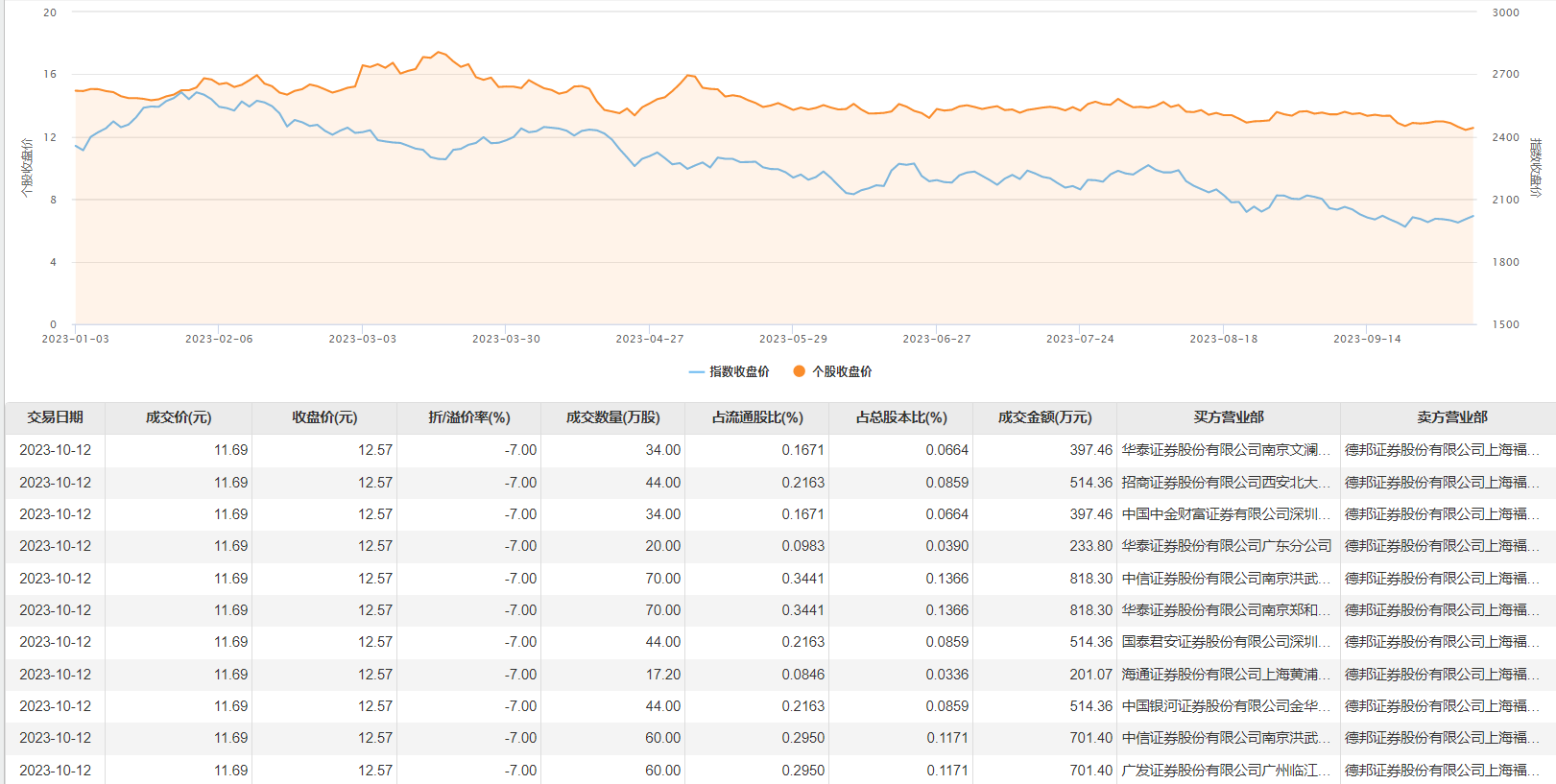 10月12日大宗交易成交497.2万股,成交额5812.27万元,占当日总成交额的75.18%,成交价11.69元,较市场收盘价折价7.0%。