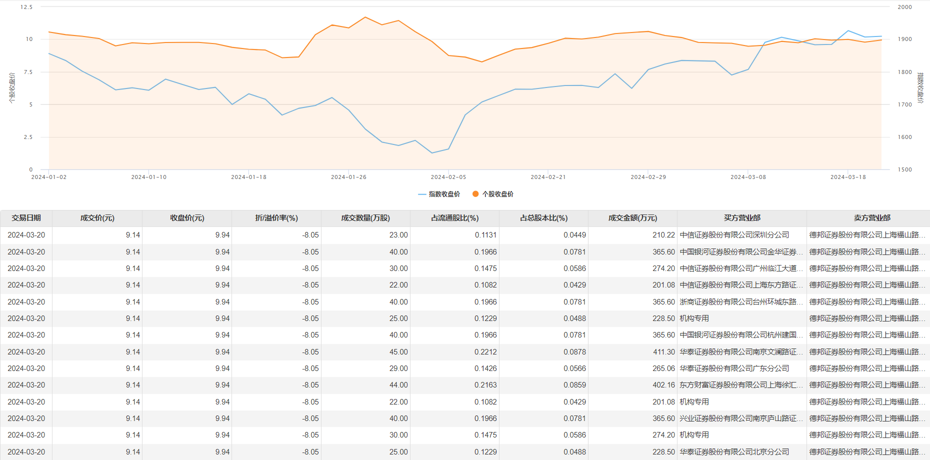 3月20日大宗交易成交455万股,成交额4158.7万元,占当日总成交额的26.76%,成交价9.14元,较市场收盘价9.94元折价8.05%。